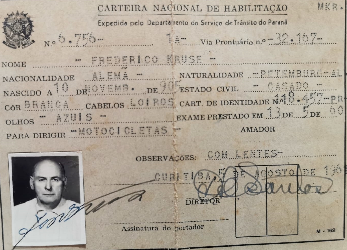Aqui, a Carteira Nacional de Habilitação, muito diferente da atual, não é verdade? Observe como consta Petemburg como a região de naturalidade de Frederico. Mas, esta informação não é a mesma que consta em outros documentos. Pelos registros que constam na obra publicada pelo Instituto Hans Staden, Família Brasileiras de Origem Germânica, vol. VI, p. 163, a localidade na Alemanha é Plettenberg. A Segunda Guerra Mundial trouxe muita destruição aos arquivos alemães. De qualquer modo, estava apto o sr. Frederico Kruse para dirigir motocicletas.